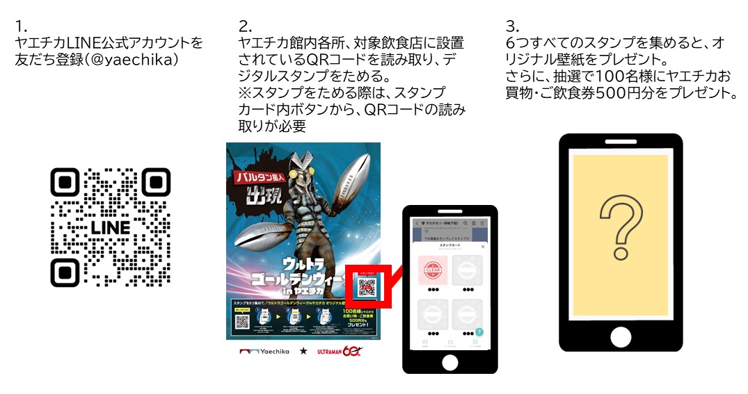 期間中ヤエチカ館内各所・対象飲食店(エネルギー補給所)にQRコードを設置。LINE内で6つ全てのデジタルスタンプを集めると「ウルトラゴールデンウィークinヤエチカ オリジナル壁紙」をプレゼント!